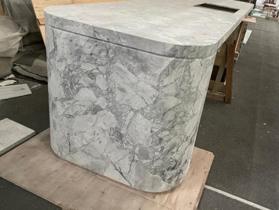 Custom Super White Quartzite reception desk featuring elegant curved edges and luxury grey veining. Durable, high-end stone furniture for modern lobbies.