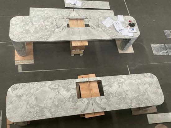 The images highlight our meticulous "cut-to-size" process, featuring integrated functional cut-outs for technology and wiring, ensuring a clean and professional workspace. This material’s natural light-reflecting properties create a bright, inviting atmosphere in any lobby, while its unique veining ensures that every desk is a one-of-a-kind installation.
