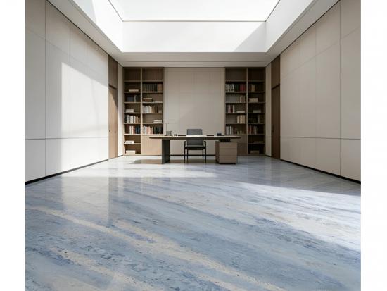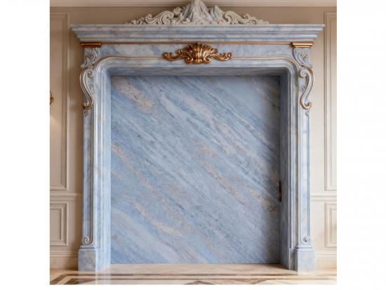 The stone features a cool blue base interwoven with crystal-like veining and gentle tonal shifts. Linear and wave-like formations move across the surface, creating a sense of rhythm and depth without appearing overly dramatic. Under natural or indirect lighting, the crystalline elements subtly reflect light, enhancing dimensionality and spatial richness.