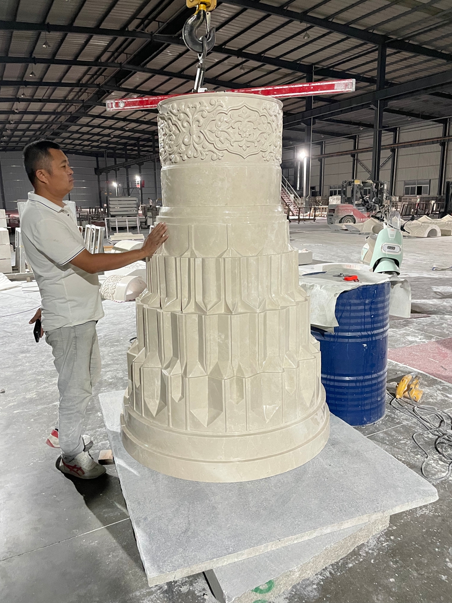 The production process included block cutting, column shaping, detailed carving, surface finishing, and final inspection prior to delivery.