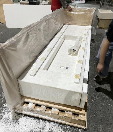 Custom foam cushioning (tailored to the product’s shape) paired with reinforced wooden crates—this dual-protection packaging securely safeguards the polished surface and curved edges of the Glacier White marble vanity top, ensuring it arrives in pristine condition even during long-haul transit.