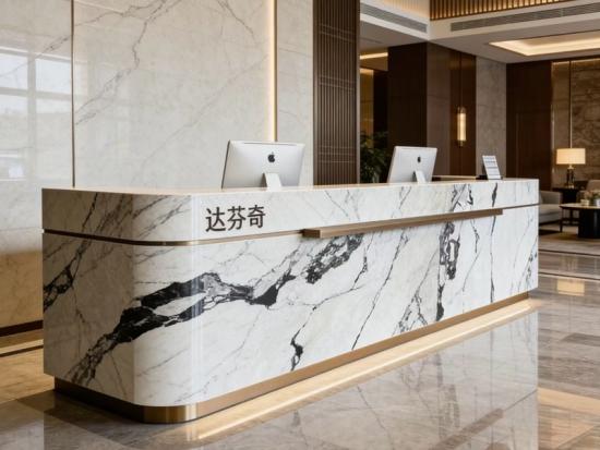 Beyond its visual brilliance, this Italian white marble is highly sought after for high-end fabrication. As seen in our featured project images, its versatility allows for the creation of stunning custom reception desks and massive kitchen islands. Whether applied to expansive floor-to-ceiling cladding or bespoke furniture, the polished finish of Da Vinci Marble reflects light beautifully, enhancing the architectural volume of any modern interior space.