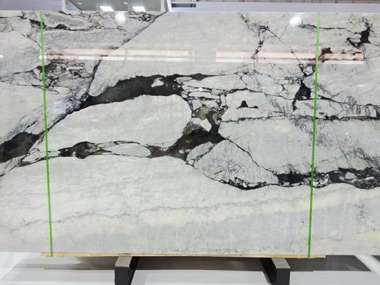 The aesthetic of Da Vinci Marble is characterized by its intense "brecciated" or "shattered" patterns. Deep grey and black mineral deposits create a powerful contrast against the milky-white base, sometimes accompanied by subtle crystalline translucent areas that add remarkable depth to the stone. This intricate linework makes it a premier choice for bookmatched installations, where slabs are mirrored to create symmetrical, high-impact feature walls in grand lobbies and luxury residences.
