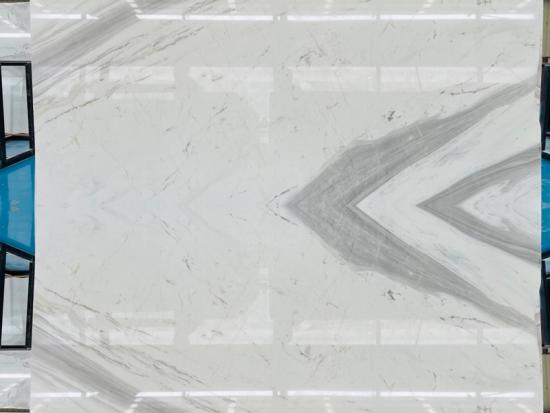 Volakas White Marble, often referred to as the "Carrara of Greece," is a premier natural stone celebrated for its sophisticated aesthetic and fluid movement. This specific batch of Bookmatched Marble Slabs represents the pinnacle of interior luxury, where two mirror-image slabs are polished on opposite sides to create a captivating, symmetrical "butterfly" or diamond pattern.